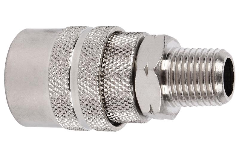 Enchufe rapido con rosca macho de 1/4", 3/8" y 1/2". Compacto y ligero para todas las instalaciones que funcionan con aire comprimido. Roscas invertidas no se necesita aplicar selladores.